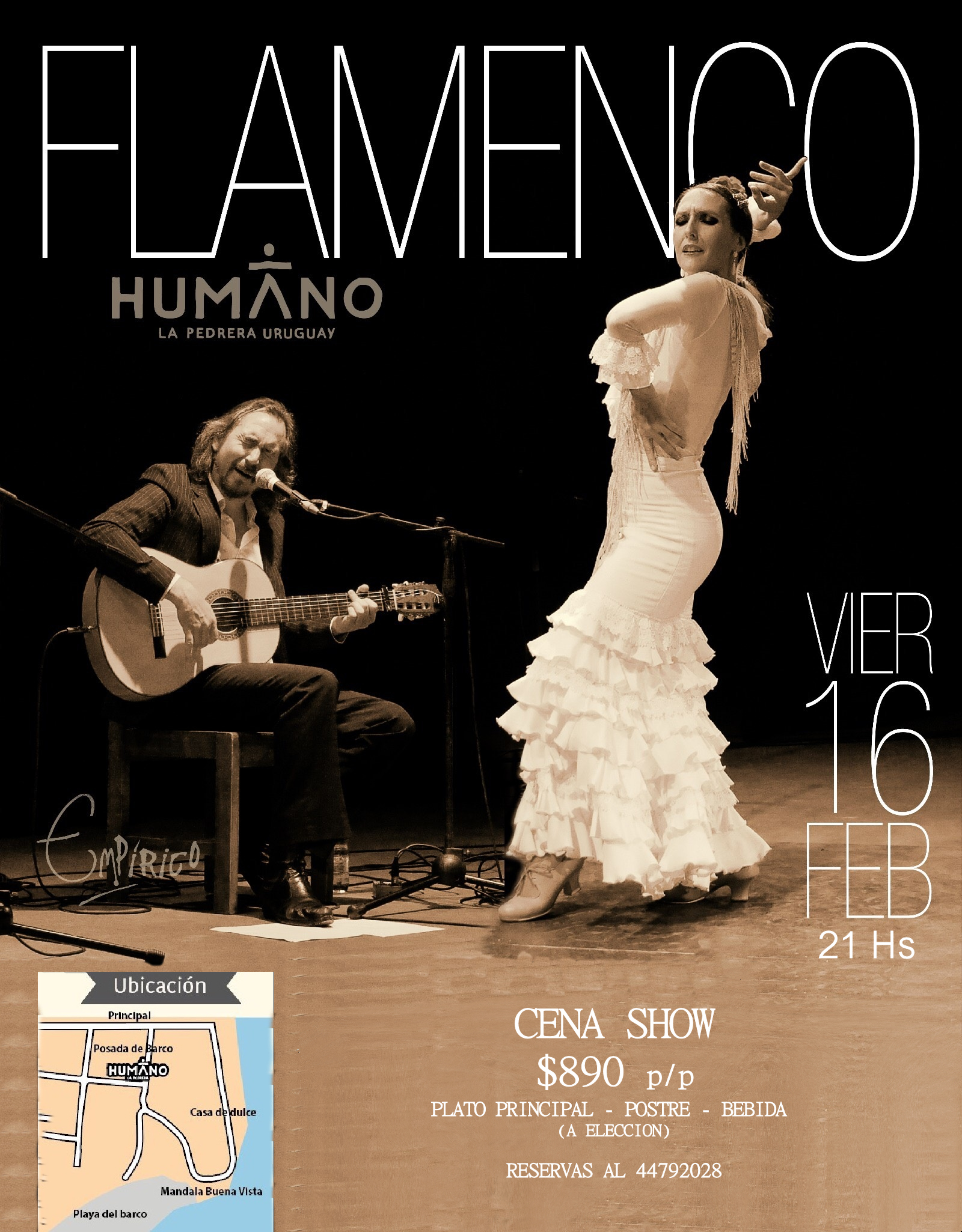 Este viernes 16 de febrero llega el flamenco a La Pedrera! A partir de las 21 hs., una fantástica cena show te espera! Los detalles en el afiche...